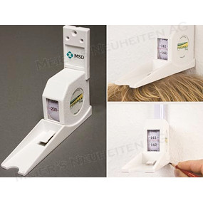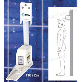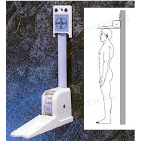 Bemerkungen: Spezialbandmass zur Ermittlung der Körpergrösse. Das Bandmass wird mit beiliegenden Schrauben an der Wand in einer Höhe von 2m befestigt. Der Anwender zieht das Bandmass nach unten und führt es bis auf den Kopf der zu messenden Person. Die exakte Körpergröße wird im Sichtfenster abgelesen.
