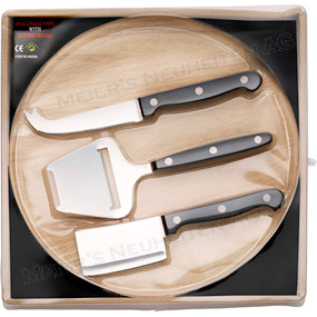 Bemerkungen: Naturholzbrett mit Käsebestecken für Hobelkäse, Hartkäse und Weichkäse. Brett Ø 25cm. Galvanische Beschriftung bis 40 x 15mm auf das grosse Messer. Das Set ist in einem Geschenkkarton mit Klarsichtdeckel verpackt.