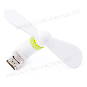 Unser USB Ventilator sorgt mit einem hohen Luftdurchsatz und leisen Betriebsgeräuschen stets für frischen Wind und lässt sich blitzschnell anschliessen. Der praktische kleine Ventilator ist jederzeit einsetzbar und sorgt z.B. bei der Arbeit am Laptop unterwegs mit Hilfe einer Powerbank oder Ihres Smartphones für Abkühlung. Er hat eine USB Schnittstelle und zum Anschluss an Geräten mit Micro USB-Schnittstelle, wie beispielsweise Smartphones, wird der Micro USB Anschluss einfach herausgeschoben. Der Ventilator hat 2 Rotorblätter aus Kunststoff. Der USB Ventilator ist angenehm klein und leicht und passt so selbst in jede Hosentasche. Die Rotorblätter sind aus weichem Gummi, es besteht also keine Verletzungsgefahr.