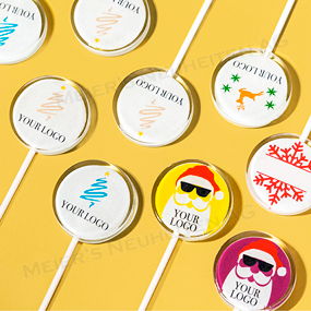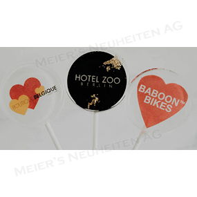 Flachlolly Zuckerfreier, Vegan Logo auf Basis Esspapier. Auf das Esspapier wird das Logo gedruckt. Das Esspapier wird in den Lolli verarbeitet und ist 100% essbar.