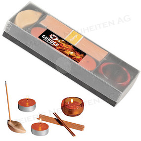 Duftset bestehend aus 3 Duftkerzen mit Orangen-, Apfel-, Lavendel-, Ocean-, oder Zitronen-Geschmack, Teelichthalter aus Glas, 10 Stk.Räucherstäbchen, Keramikhalter für die Räucherstäbchen in Blattform.