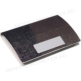 Dieses Visitenkarten-Etui mit dem eleganten Bicolor-Dekor ist ideal dazu geeignet, Ihre Geschäftskarten zu schützen und Kunden zu beeindrucken. Dank der besonderen Faltung im Deckel lässt sich das Etui in einen Visitenkartenständer verwandeln. Lassen Sie Ihre Werbung im Druckverfahren oder durch Laserung auf der Metallplakette anbringen! |