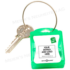MyKit Schlüsselanhänger sorgfältig zusammengestellt für alle möglichen Situationen, mit einer Auswahl aus 6 Sets Gehörschutz, Pflaster, Blasenpflaster, Mund zu Mund Schutz, Fahrrad-Reparatur, Nähset. MyKit Schlüsselanhänger sind ab 500 Stück erhältlich selbstverständlich mit individuellem Druck auf der Box! |