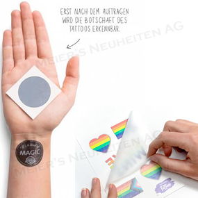 Schweiss- und Wasserfest, mit Organics Papierabdeckung, 100% Vegan, wird regelmässig dermatologisch getestet. Ob auf Events, für individuelle Promotionkampagnen oder als kreatives Give-Away – Klebetattoos bieten vielfältige Einsatzmöglichkeiten für jegliche Altersgruppen. |